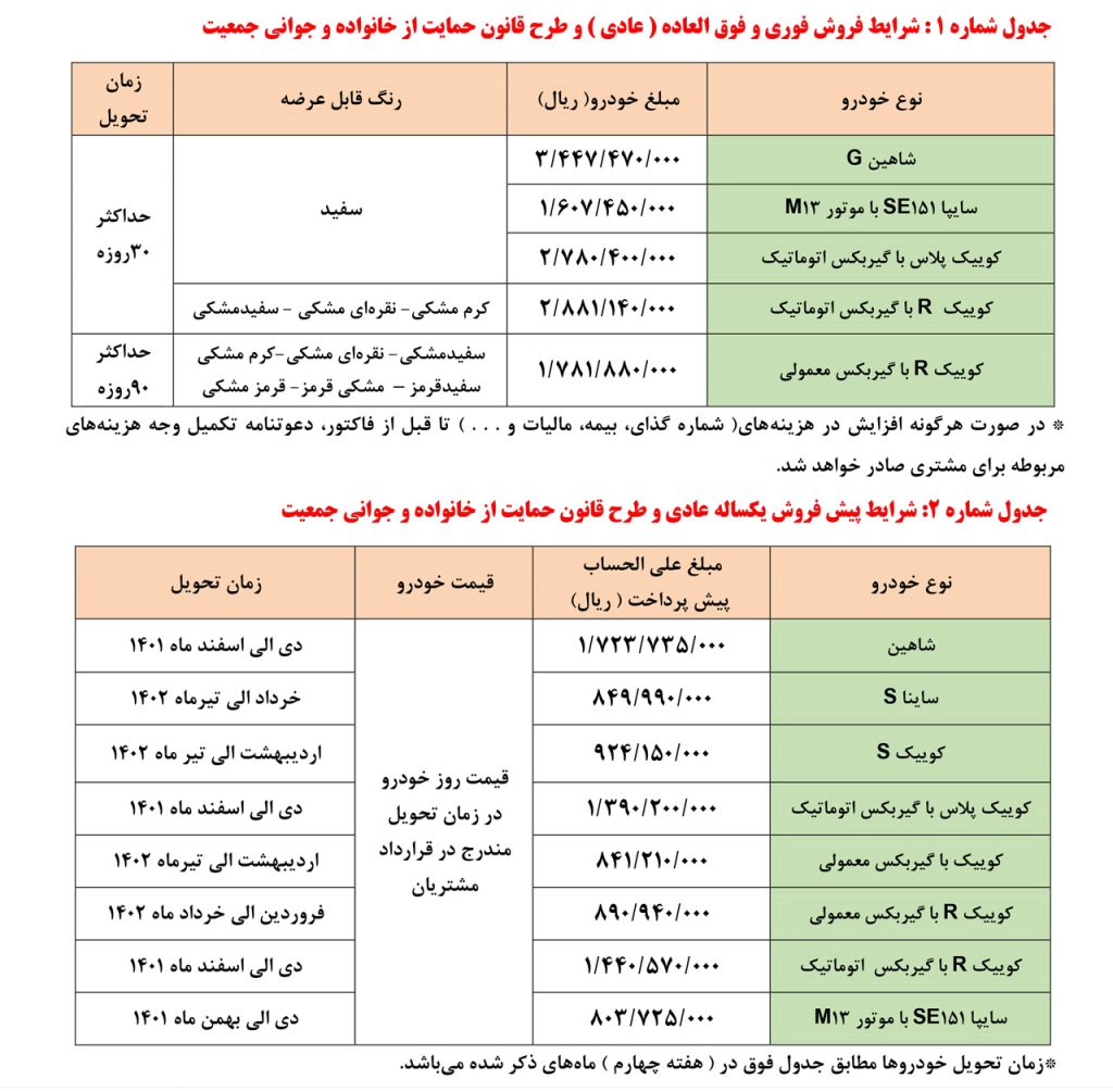 بر این اساس، شرایط پیش فروش و فورش نقدی محصولات سایپا، برای مهر ۱۴۰۱ اعلام شده است. در این شرایط فروش، فروش به صورت قرعه کشی حذف شده است. در شرایط فروش فوری سایپا خودروهای شاهین G، پراید وانت ۱۵۱، کوییک پلاس اتوماتیک، کوییک R اتوماتیک و کوییک R معمولی عرضه شده است که زمان تحویل این محصولات بین ۳۰ الی ۹۰ روز کاری است. شرایط ثبت نام سایپا، برای دو خودرو شاهین و پراید ۱۵۱ بدون محدودیت و صرفا داشتن گواهینامه و برای سایر خودروها محدودیت خرید از خودروسازان طی ۱۸ ماه گذشته و داشتن گواهینامه لازم است.