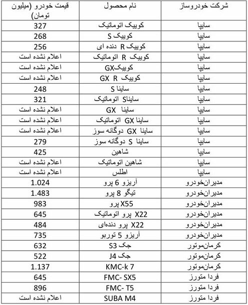 ضمن اینکه برخی محصولاتی که خودروسازان در این مرحله عرضه کردهاند، مدلهای جدید محسوب میشوند و در جدول مصوب شورای رقابت وجود نداشته و این خودروها فعلا قیمت مصوب ندارند؛ هر چند میتوان متناسب با محصولات همرده، قیمت تقریبی آنها را تخمین زد.