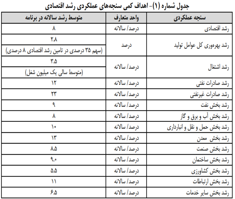 در متن ۱۵۰ صفحهای لایحه برنامه هفتم توسعه، دولت در قالب ۲۴ فصل مجزا به موضوعات مختلفی پرداخته است که ۱۳ فصل نخست آن اقتصاد و مسائل مرتبط با آن است. فصل اول به رشد اقتصادی و برنامههای دولت برای تحقق اعداد و ارقام در نظر گرفته شده تا پایان برنامه هفتم توسعه اختصاص دارد. در ماده ۲ لایحه برنامه هفتم توسعه و در جدول شماره یک، اهداف کمی سنجههای عملکردی رشد اقتصادی در حوزههای مختلف (رشد اقتصادی، رشد بهرهوری کل عوامل تولید، رشد اشتغال، رشد صادرات نفتی، رشد صادرات غیرنفتی و رشد در بخشهای مختلف نفت، صنعت، کشاورزی، معدن، و…) مورد بررسی قرار گرفته است.