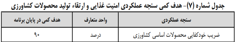 ضریب خودکفایی ۹۰ درصدی محصولات اساسی کشاورزی نیز هدف کمی دیگری است که دولت در قالب ماده ۳۲ فصل هفتم لایحه برنامه هفتم توسعه تحت عنوان امنیت غذایی و ارتقاء تولید محصولات کشاورزی برای خود تا پایان این برنامه در نظر گرفته است.