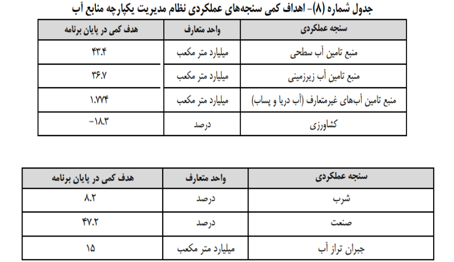 فصل هشتم این لایحه به موضوع نظام مدیریت یکپارچه منابع آب پرداخته و دولت در قالب ماده ۳۷ و جدول شماره ۸ اهداف کمی دیگری برای خود در نظر گرفته است. منبع تامین آب سطحی و زیر زمینی، منبع تامین آبهای غیرمتعارف (آب دریا و پساب) و کشاورزی چهار هدف کمی است که در این زمینه تعریف شده و هر کدام از آنها تا پایان برنامه هفتم توسعه عددی به عنوان هدف دارند که در جدول زیر قابل مشاهده است.