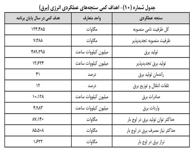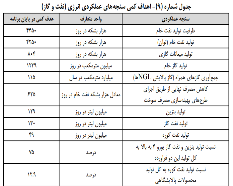 اهداف کمی سنجههای عملکردی در حوزه انرژی (نفت، گاز و برق) نیز در قالب جدول شماره ۹ و ۱۰ ماده ۴۲ لایحه برنامه هفتم توسعه به تعیین اعداد ارقامی در حوزه ظرفیت تولید نفت، گاز، بنزین، برق و… اختصاص دارد که دولت در فصل ۹ با عنوان رفع ناترازی انرژی برای خود تا پایان برنامه هفتم توسعه تعیین کرده است.