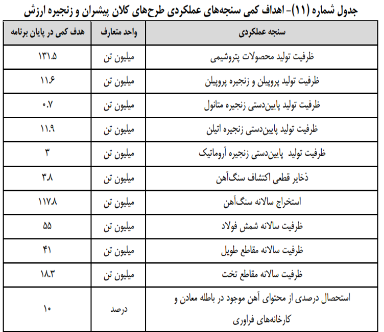 ۱۷ طرح کلان پیشران و زنجیره ارزش نیز در قالب فصل دهم لایحه برنامه هفتم توسعه مشخص شده است که به تولید محصولات پتروشیمی، پروپیلن، متانول، اتیلن، سنگ آهن، فولاد، مس و غیره اختصاص دارد و جزئیات آن را در جدول زیر میتوانید اهداف کمی مشخص شده در این بخشها را مشاهده کنید.