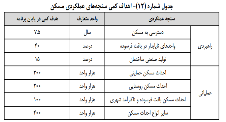 ماده ۴۹ فصل یازدهم لایحه برنامه هفتم توسعه هم به اهداف کمی مشخص شده دولت در حوزه توسعه مسکن بر میگردد. در جدول شماره ۱۲ این برنامه، اهداف راهبردی مانند دسترسی به مسکن، واحدهای ناپایدار در بافت فرسوده و تولید صنعتی ساختمان و اهداف عملیاتی از جمله احداث مسکن حمایتی و روستایی، احداث مسکن بافت فرسوده و ناکارآمد شهری و سایر انواع احداث مسکن به تفکیک مورد بررسی قرار گرفته که در زیر قابل مشاهده است.
