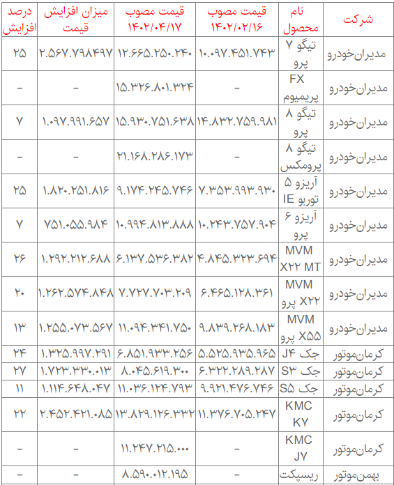 جدول زیر بر اساس مصوبه اول این شورا در ۱۶ اردیبهشت ماه و مصوبه روز گذشته، در تعیین قیمت پایه خودروهای مونتاژی تهیه شده است.