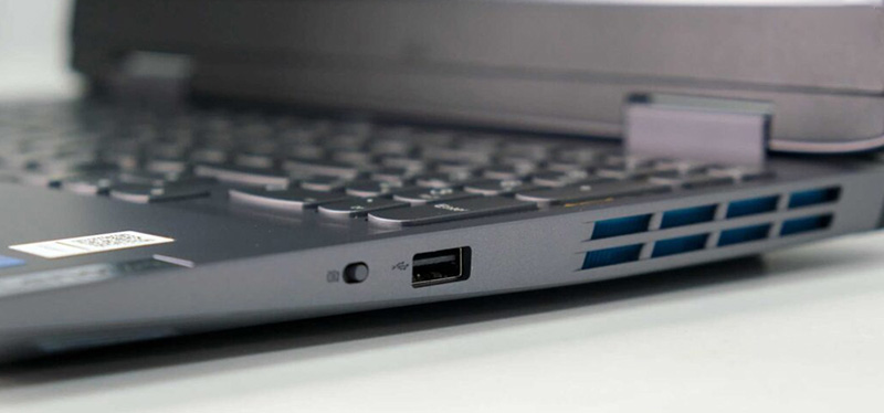 در قسمت چپ این لپ تاپ، جک ۳.۵ میلیمتری برای هدفون و میکروفون و یک پورت USB-C با سرعت ۱۰ گیگابیت در ثانیه طراحی شده که اگر به مانیتور جداگانه نیاز داشتید، از خروجی تصویر DisplayPort 1.4 پشتیبانی می کند. این مدل از لپ تاپ لنوو، شارژر ۱۴۰ واتیPower Delivery دارد. در قسمت راست دستگاه، یک پورت USB-A برای ماوس تعبیه شده است.